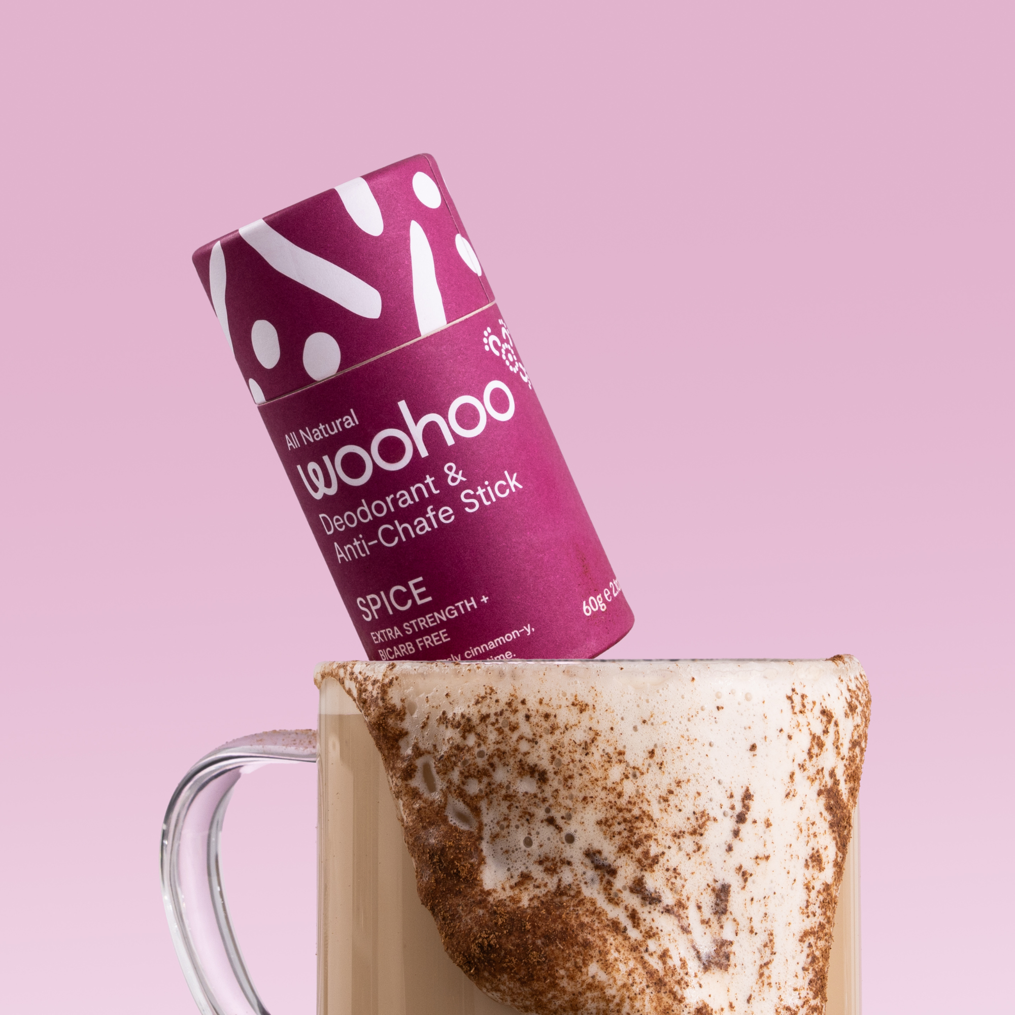 Say hello to Woohoo Spice – our limited-edition, extra-strength, bicarb-free natural deodorant stick that’s cosy, confident and a little cheeky. Scented with cinnamon, cedarwood, nutmeg & sweet vanilla, this eco-friendly cardboard tube keeps you fresh and unstoppable all day long.